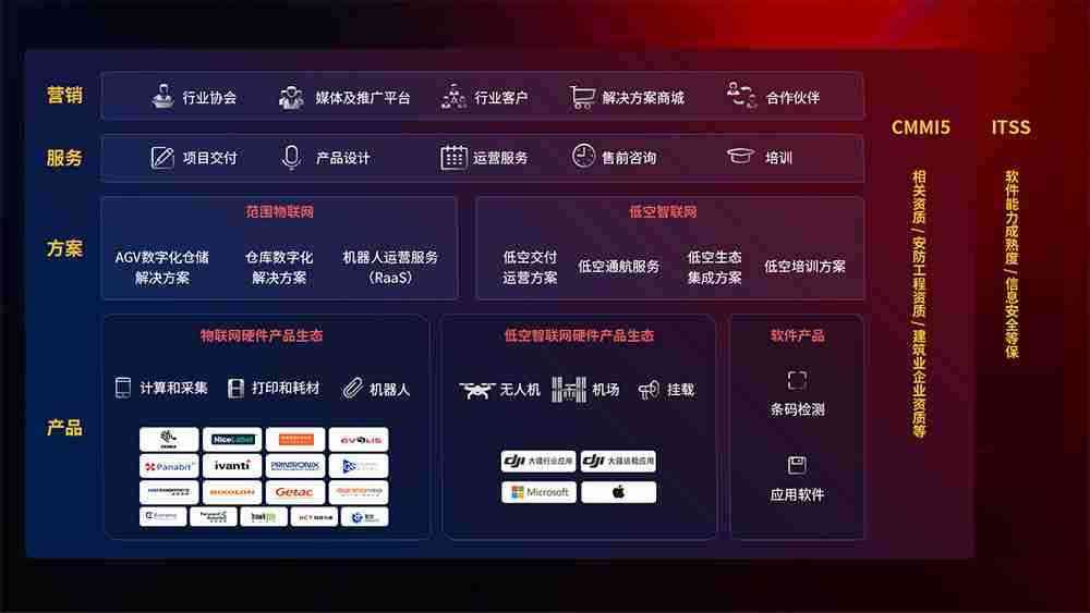 聚合国内外先进的物联网硬件产品品牌,,,,聚焦数字化仓储、、、机器人运营、、低空智联网等领域,,,,共同打造适合客户业务场景的解决方案并提供交付服务