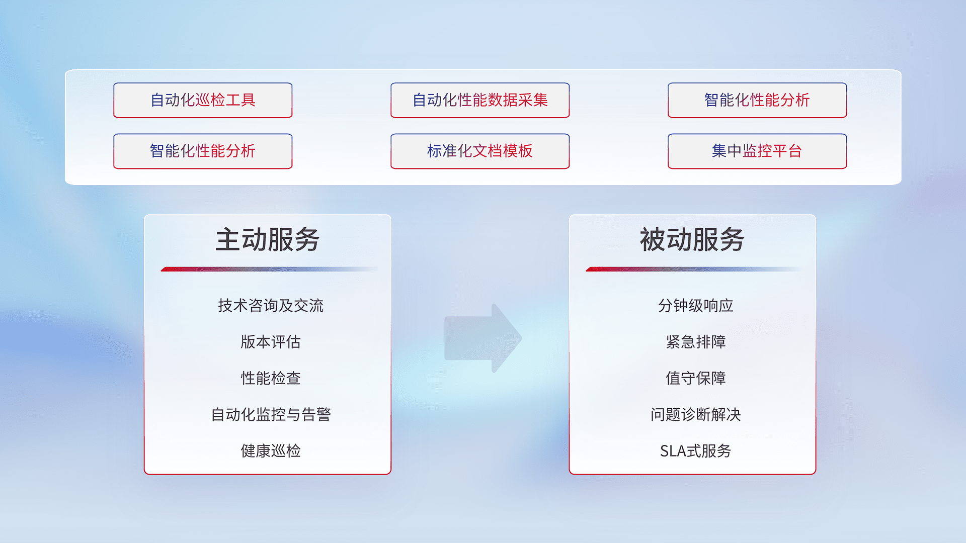 智能化工具和标准化文档,,,保障服务质量,,提供主动服务(包含技术咨询、、版本评估、、、、性能检查、、、、自动化监控与告警、、健康巡检)和被动服务包含(分钟级响应、、、紧急排障、、、、值守保障、、、、问题诊断解决、、SLA服务)。。。