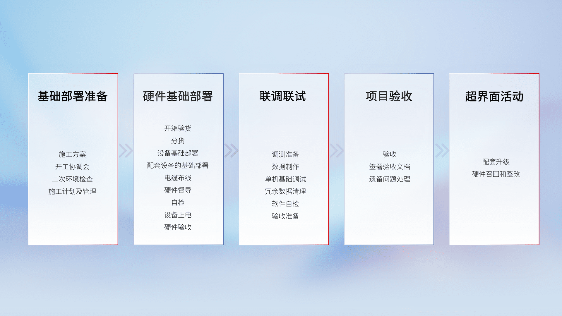 从基础部署准备、、、硬件基础部署、、、、联调联试、、、、项目验收、、、越界面活动的全过程可追溯,,保证施工质量和进度。。。。